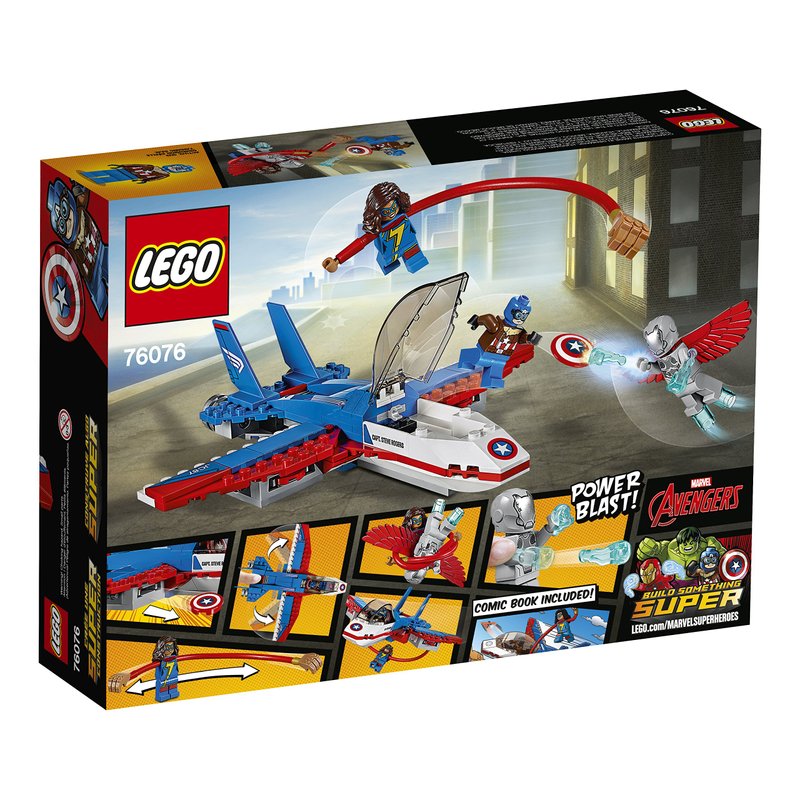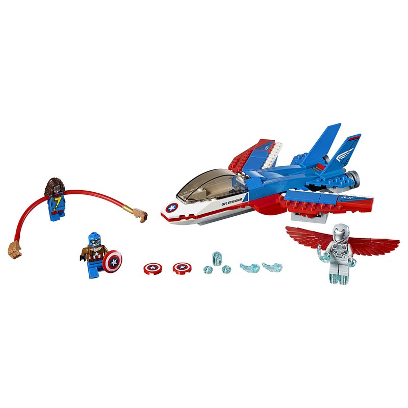 - Captain America's jet features sweep back wings, dual disc shooters and a minifigure cockpit with shield holder and Captain America logo