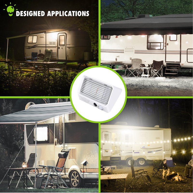 Leisure LED Rectangle Night Sensor Porch Light Without Switch 300 Lumen Cool White Description: LED Rectangle Porch Light Fixture 300 Lumens Made with Environment-friendly technology and materials. Wide Voltage Range : 11-18 volts Applications include 12 Volts DC recreational vehicles.
