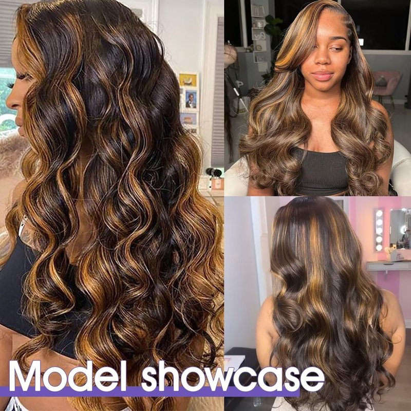 Lemoda Full 13x6 Highlight Body Wave Lace Frontal Human Hair Wigs 250% Density Medium-length Ombre P4/27 Piano Color Bob Wigs 12A HD Transparent Lace Wig For Women Pre Plucked Natural Hairline 16Inch