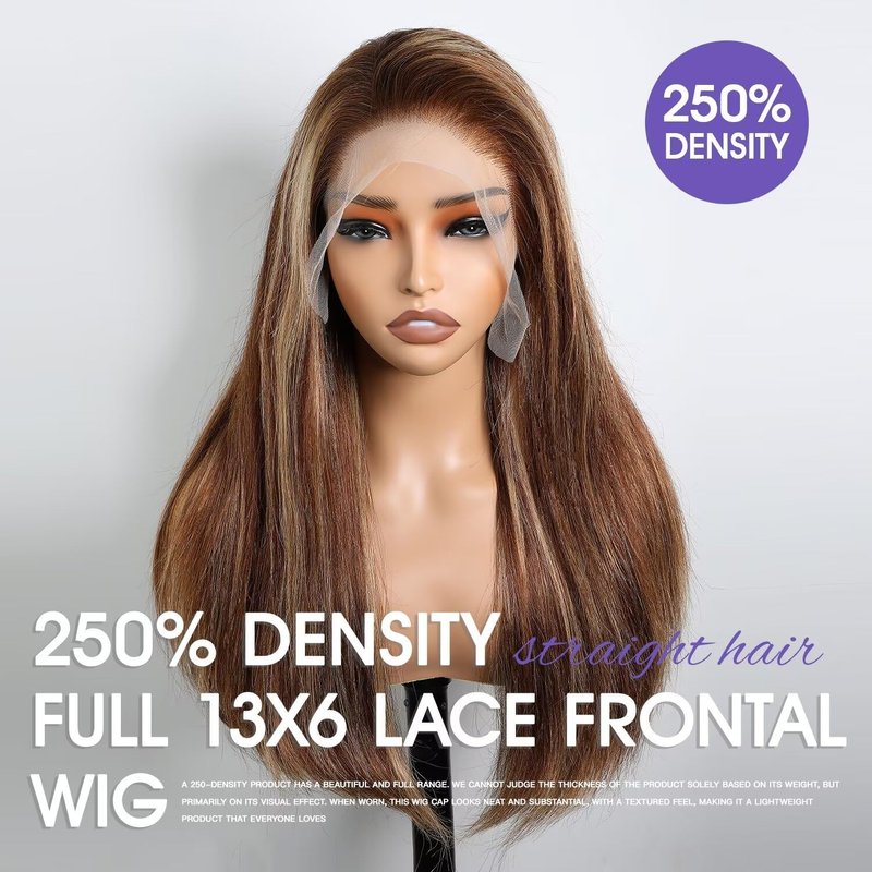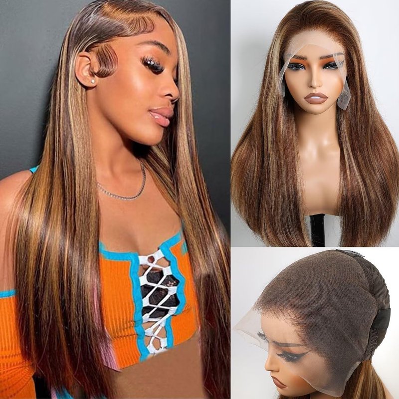 Lemoda Full 13x6 Highlight Straight Lace Frontal Human Hair Wigs 250% Density Medium-length Ombre P4/27 Piano Color Bob Wigs 12A HD Transparent Lace Wig For Women Pre Plucked Natural Hairline 16Inch