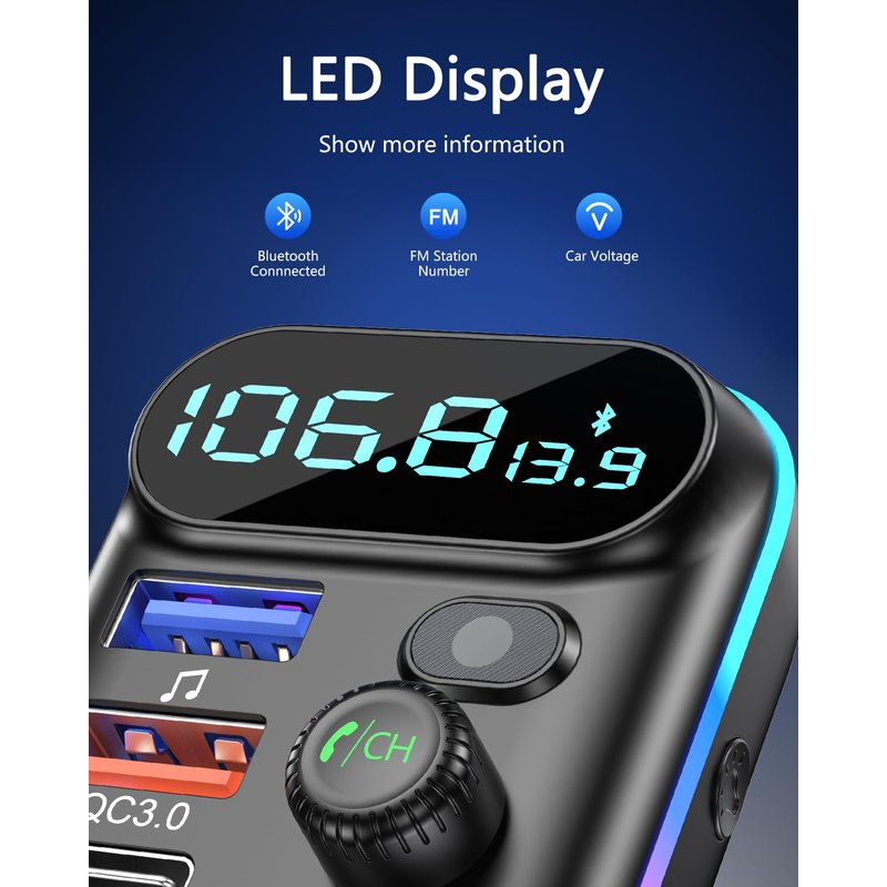 - [ 9-Color LED Design and Light Off] The car FM transmitter is designed with 9-color LED lights: red, blue, green, yellow, purple, cyan, white, rainbow, rainbow flow and light off. You will see the pulsating light in the dark and adjust the color you want. Facilitate the operation and safer driving when driving at night.