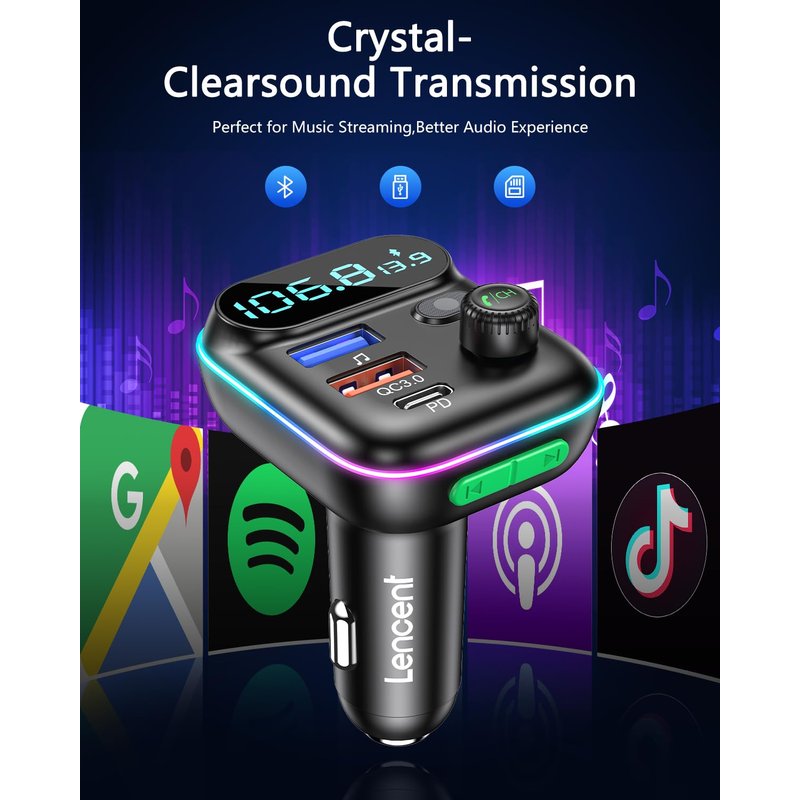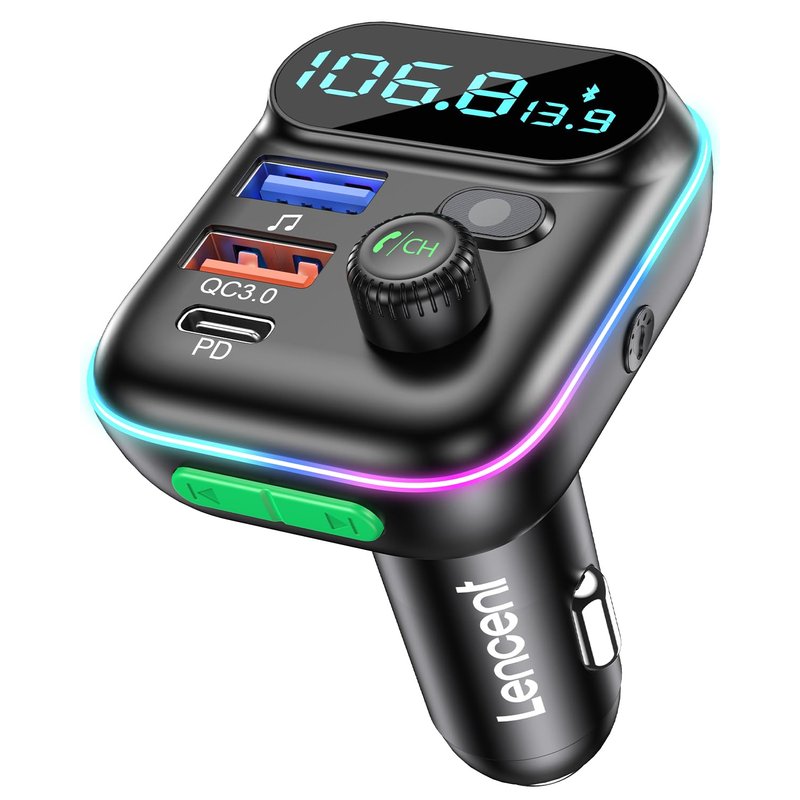 LENCENT FM Transmitter in-Car Adapter, Wireless Bluetooth 5.0 Radio Car Kit,Type-C PD + QC3.0 Fast USB Charger, Hands Free Calling, Mp3 Player Receiver Hi Fi Bass Support U Disk