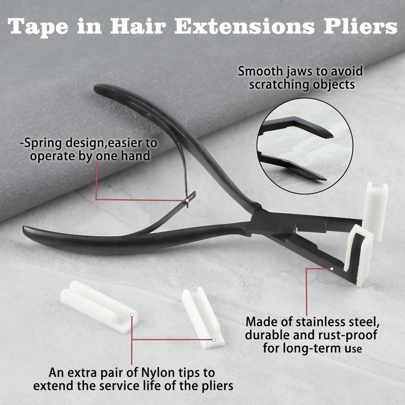 - Design: The hair extensions tools pliers design two nylon pads jaws on top. Peel, stick and press with our tape pliers, make it seal the tape in human hair extensions easily and gently. Looks more natural and firmer, and it can also prolong the usage of hair extensions.