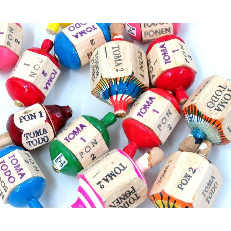 Traditional wood six sided Mexican toy for children and adults. Each side has an instruction, and players follow the instruction. It can be played with chips, or with coins. Ships in assorted colors.