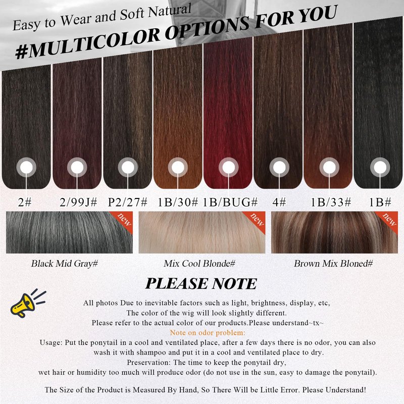 - Washable& Comfortable: Our straight hair pieces are handled by the Yaki process, which makes them lightweight and fluffy, maintains the shape and is comfortable to wear. You can wash these ponytail extensions in warm water with some gentle shampoo. It is recommended to put them on the towel and dry naturally.