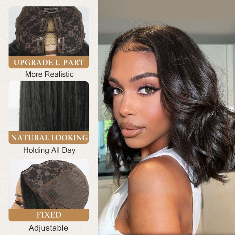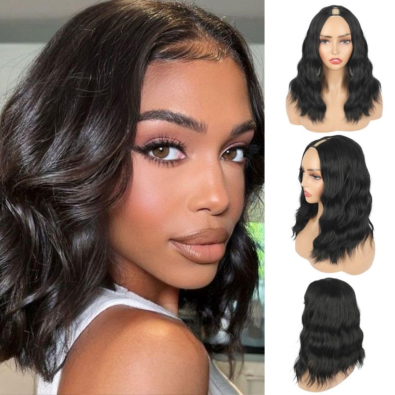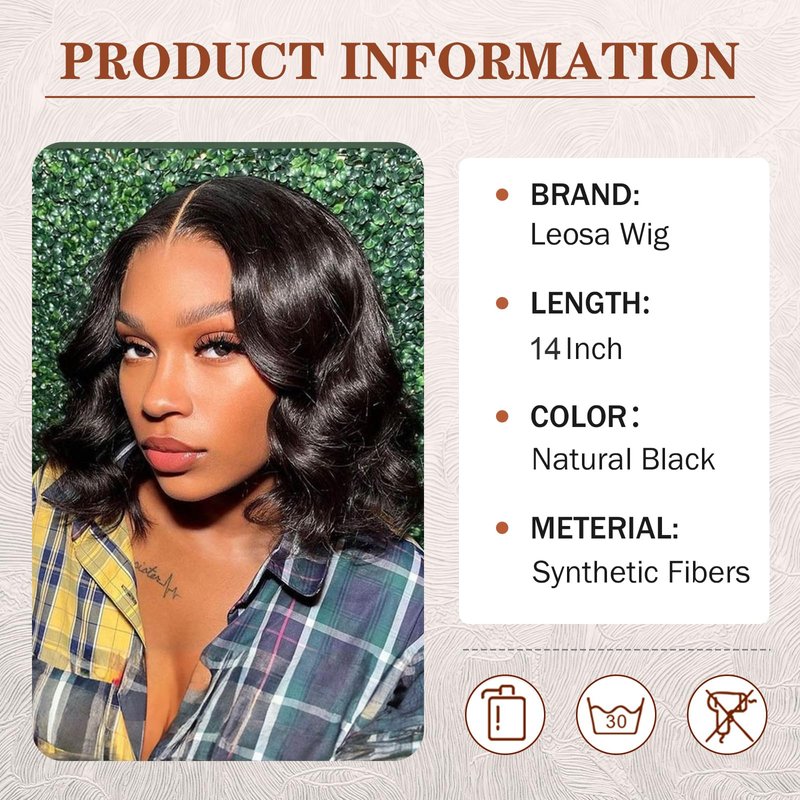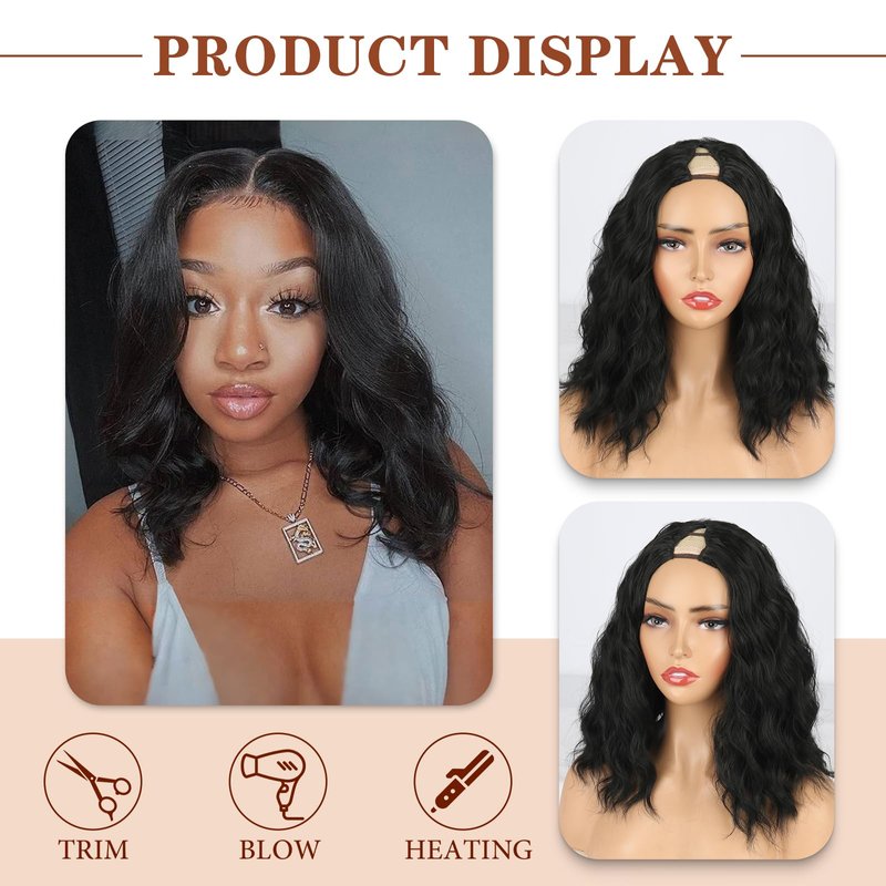 LEOSA Black Bob Wavy V Part Wig V Part Wig V/U Part Wig for Black Women Double-leaf Wig V Part Wig Full Head Clip In Hair Extensions Wig Synthetic Hair Replacement Wigs (14Inch, 14-1B#)