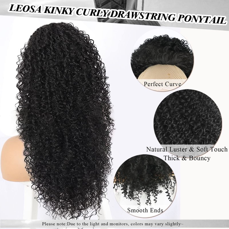 LEOSA Kinky Curly Ponytail Extension for Black Women Black Drawstring Ponytail Synthetic Long Afro Kinky Ponytail Extension Deep Curly Instant Clip Hair Ponytail 26inch