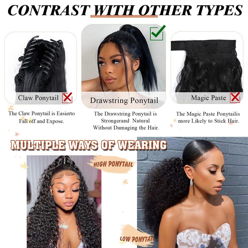 - {Easy to Wear & Advantage}:Kinky curly ponytail is quick and easy to attach just as fast(Two Clips Adjustable Size) as you would pull up your own hair into a ponytail. With a pull and a tuck, it's secure and stays attached, It's the right choice for beginners. kinky ponytail Advantage: Compared with the claw ponytail clip, this ponytails are lighter , comfortable to wear & secure. Compared with magic paste ponytails, this ponytails are not easy to get tangled and easy to take off.