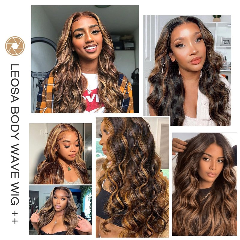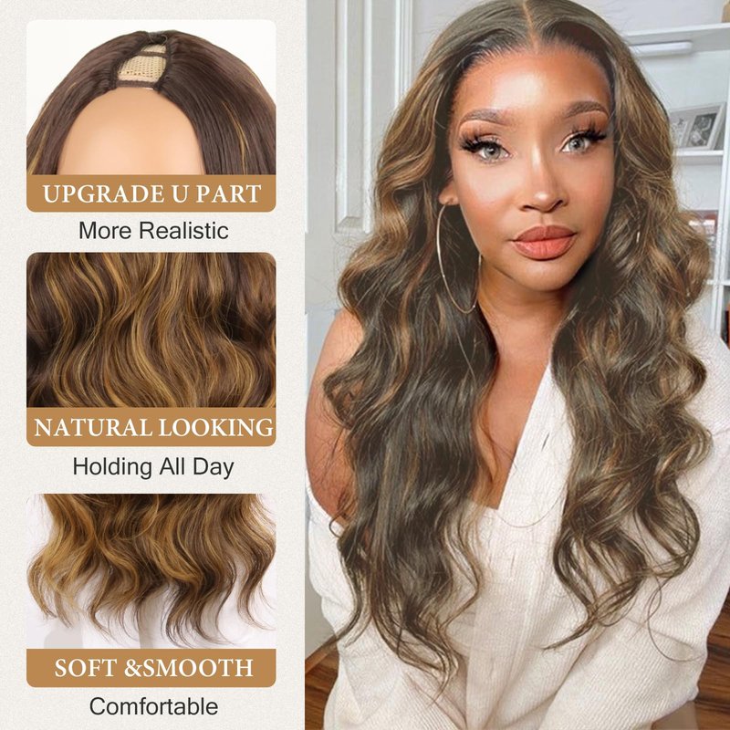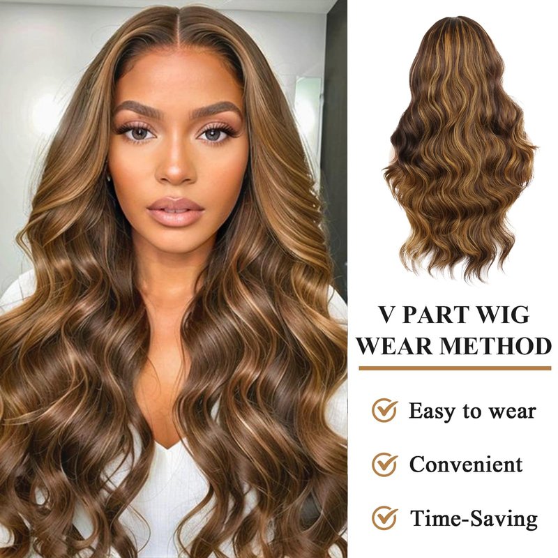 LEOSA Long Body Body V Part Wig for Black Women Highlight Brown U/V Part Wig Highlight Full Head Clip In Hair Extensions Long Body Wave Wig for Women Synthetic Hair Replacement Wig (24Inch 4H27#)