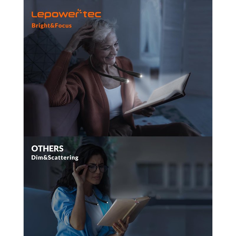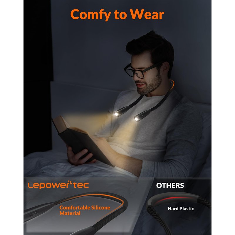 - Skin-Friendly Silicone: LEPOWER-TEC upgraded reading light adopts soft silicone material to wrap entire surface, provide a softer and more comfy wearing feeling for you. Compared with the book lights for reading at night in bed with plastic or artificial leather on the market, the book light will not rub and hurt your neck skin or hair.
