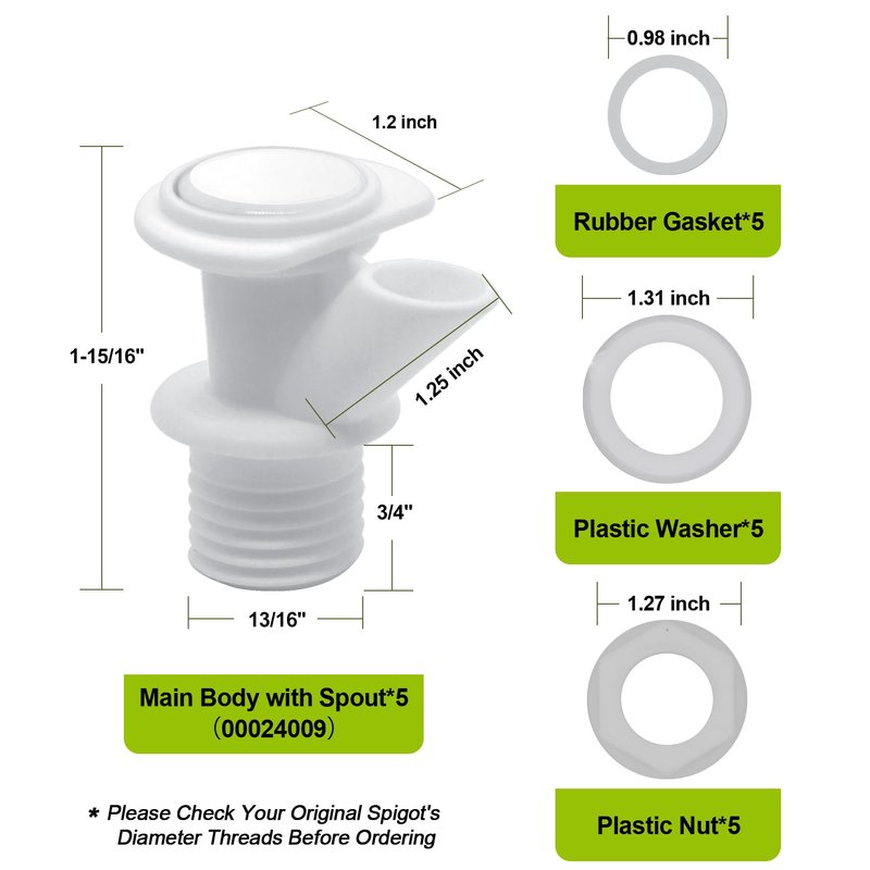 - 【PACKAGE】- Our replacement spigot kit for Igloo includes 5-main body with spout, 5-plastic nut, 5-rubber gasket and 5-plastic washer. A perfect replacement for your broken standard spigots used on Igloo coolers 2, 3, 5 and 10 gallon. It can also work on other various water/beverage dispensers/containers/coolers/bottles by drilling a 13/16” hole (this push button valve has 13/16” diameter threads) into them.