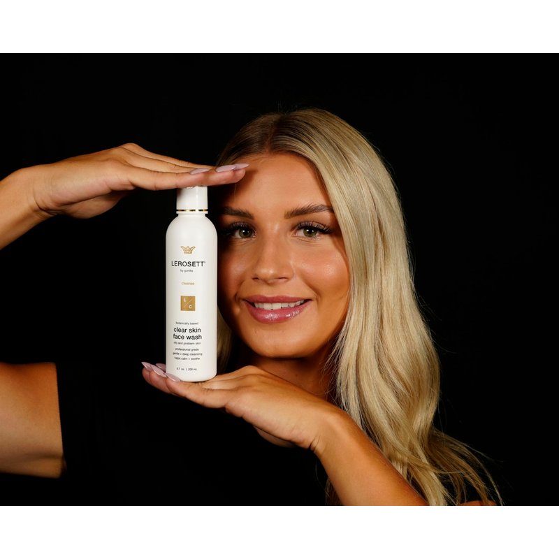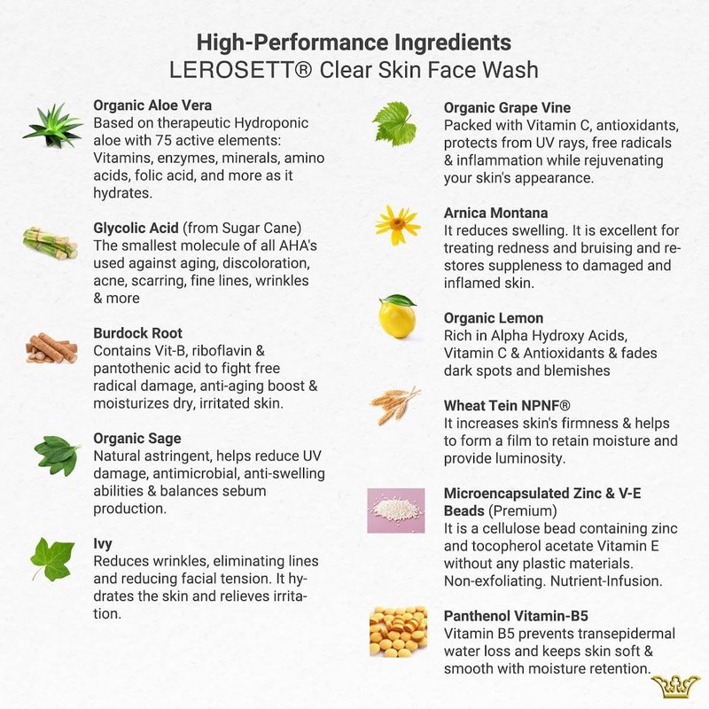 LEROSETT Face Wash for Clear Skin, Gentle Exfoliating Cleanser, Targets Pores, Blemishes & Oily Skin, Aloe-Based, 12 Botanicals, Glycolic Acid, Softens Skin, Vegan Non-Drying - 60-Day 6.7 oz.