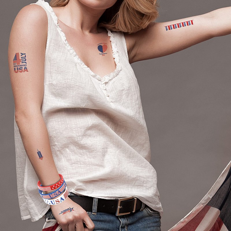 - 【Tattoo Sticker】 Red, white, blue and metallic temporary tattoos featuring handdrawn designs of fireworks, American flags, eagles, ect. These metallic temporary tattoos will last for 1~5 days and keep its flash look. Can be removed with oil, makeup remover, or by scrubbing off. Each tattoo measures 2.67 x 4.72 inches.