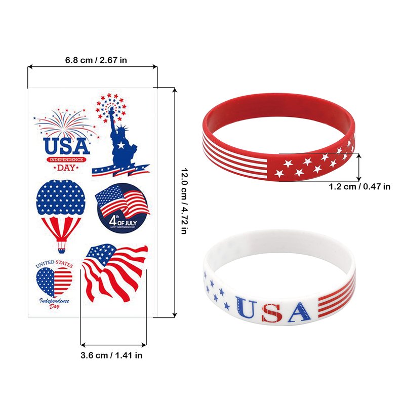 - 【Value package】 You will get 24 pcs USA Flag Silicone Wristbands (4 styles, 6 pcs for each), and 12 pcs Patriotic themed Tattoo Stickers (6 styles, 2 pcs for each). The quantity is enough to match your needs.