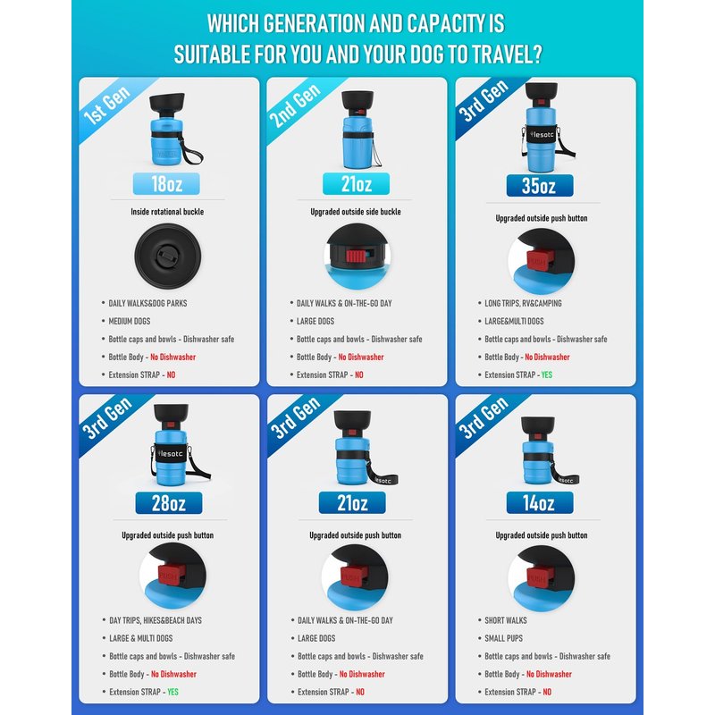 - Large Capacity: lesotc dog water bottle with a volume of 18oz/520ml. Dog travel water bottle can provide safe, fresh, and healthy water for puppy during long walking, travel, hiking, camping and other outdoor activities. It’s addition to your dog accessories, perfect for dog beach essentials and dog camping essentials