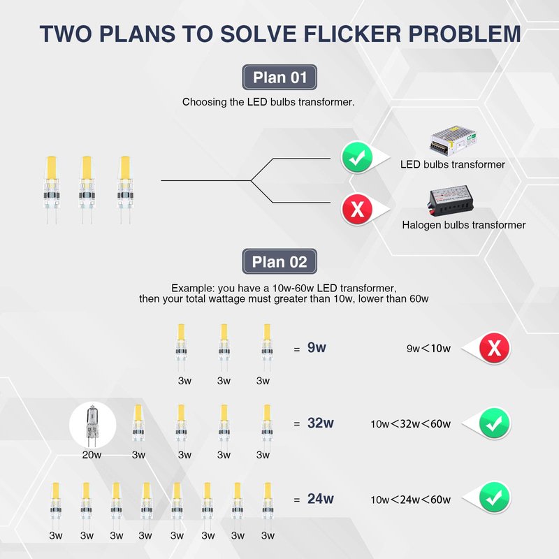 If your lamps used halogen bulbs before, you need to replace 4-5 bulbs together when replacing . Otherwise, it maybe will flickering . The reason is that the power of this bulbs is much lower than halogen bulbs