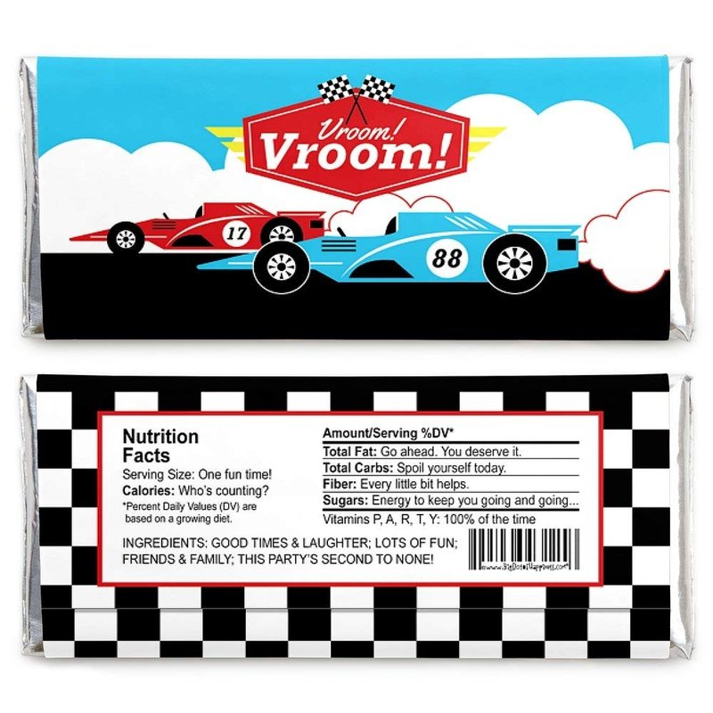 - Let’s Go Racing Standard Candy Bar Wrapper Kit INCLUDES 24 chocolate bar wrappers and 24 foils, perfect for styling an adorable racecar candy buffet or unique Let’s Go Racing baby shower or race car birthday party favors.