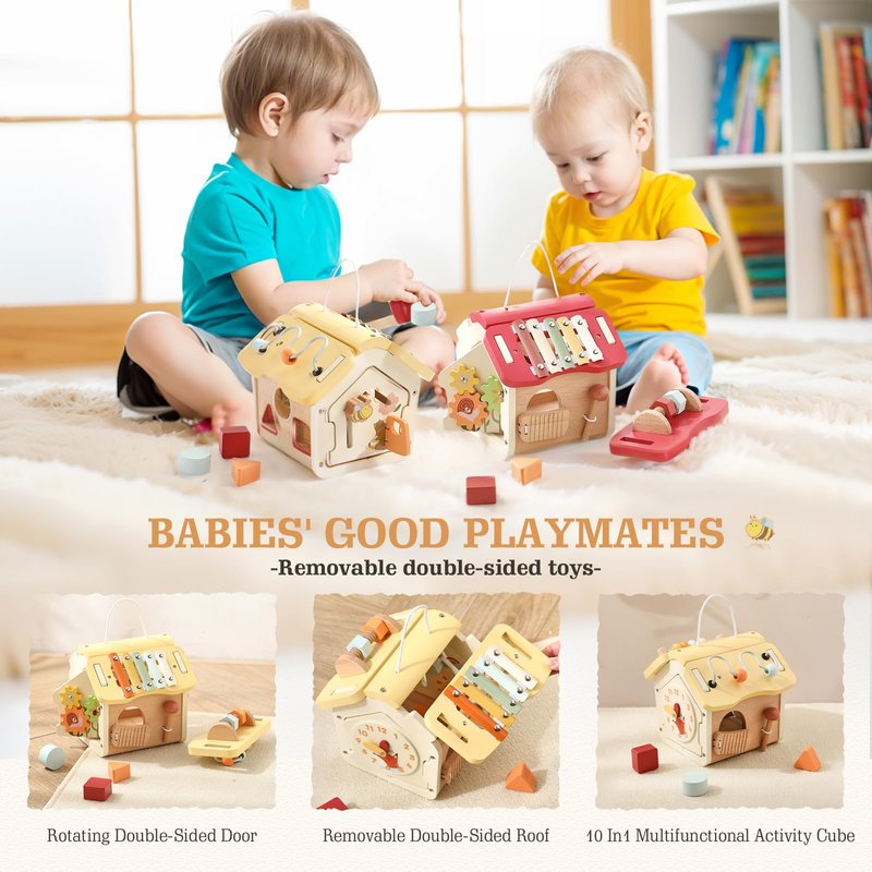 let's make Wooden Activity Cube 10-in-1 Montessori Toys Multi-Functional House Educational Toys Sensory Learning Activity Cube for Toddlers Babies 1st Birthday Gift