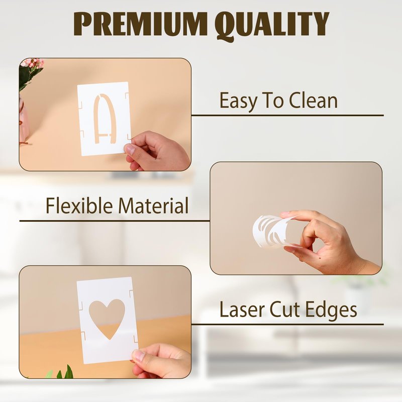 - High-Quality Material: The lettering Painting Stencils are made of high-quality eco-friendly PET material, durable for you to use, and not easy to break.Can be reused after cleaning