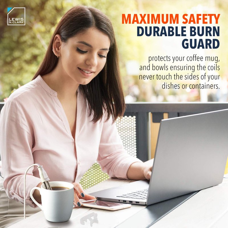 - MAXIMUM SAFETY: Durable burn guard protects your coffee mug, cups, and bowls ensuring the coils never touch the sides of your dishes or containers. Safely heat coffee, tea, soup, hot chocolate, and more.