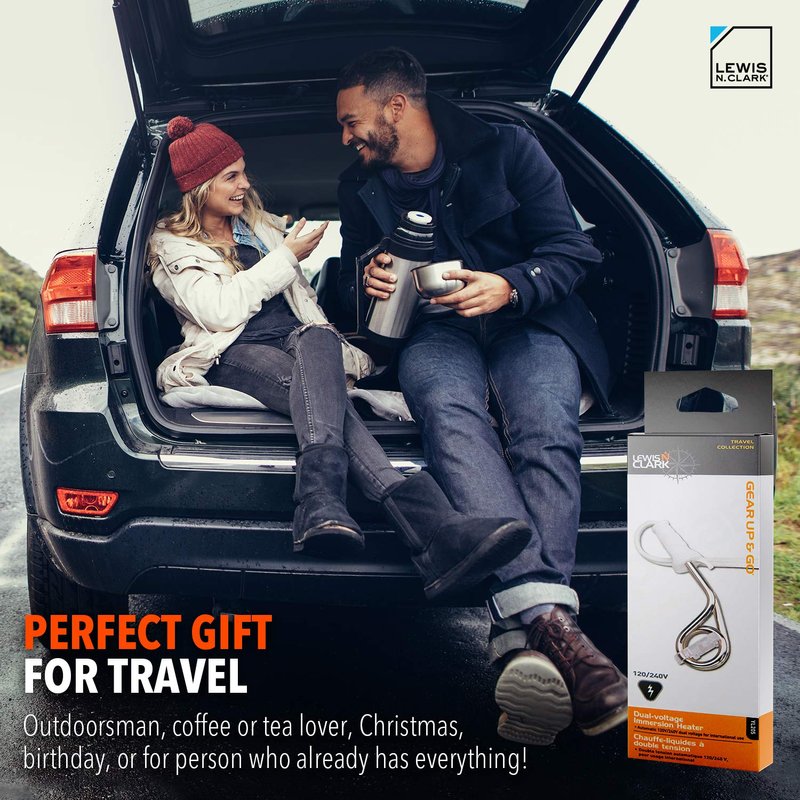 Lewis N. Clark Portable Immersion Water Heater, Electric Kettle Alternative for Coffee, Tea + Hot Chocolate, Camping, Travel + Office with Travel Adapter, White