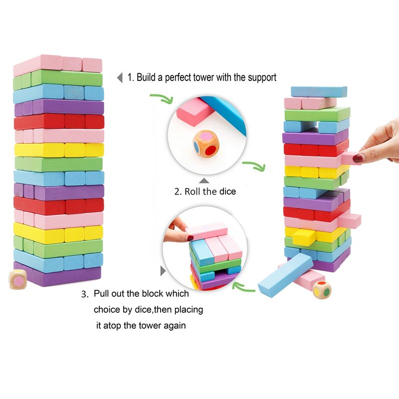 - Players will take turns rolling the dice, then carefully removing one block of that color and re-positioning it on the top of the tower. The blocks have a smooth surface making it easy to remove. The player who knocks down the tower is the loser