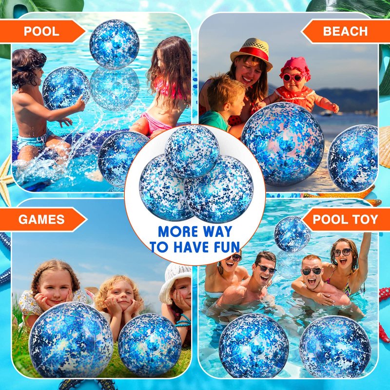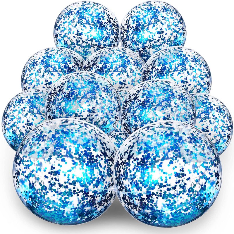 - Glitter Confetti Beach Ball: you can get 2 pieces 24 inch huge beach balls and 10 pieces 16 inch clear beach balls, all with glitter confetti inside, 12 pieces with 2 sizes could satisfy your needs of playing even as decoration, or play with your partners and family