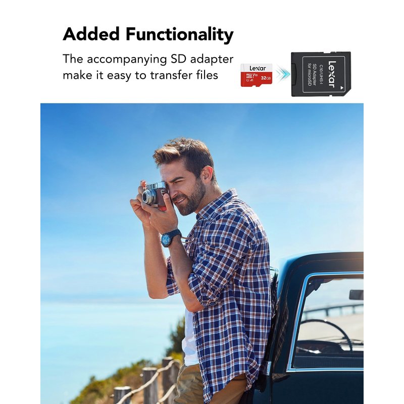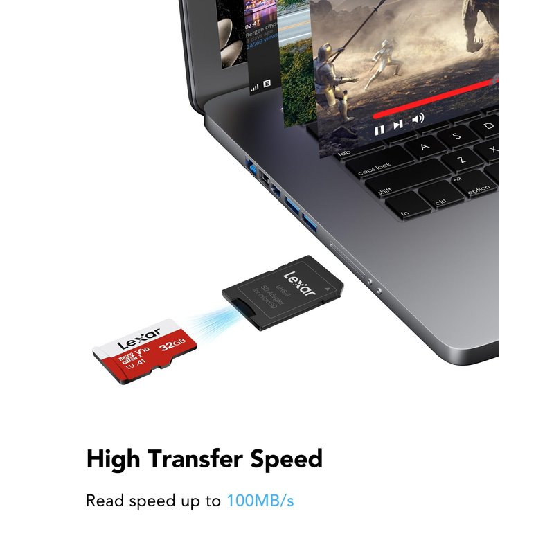 - Lexar 32GB Micro SD Card supports up to 100MB/s read speed and up to standard write speed for data transfer. (Based on internal test environment of Lexar, so the actual speed may vary with different host devices and environments. For devices that don't support UHS-I, the transmission speed will be different due to interface limitations.)
