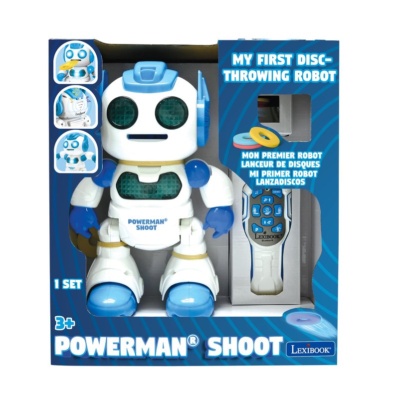 LEXiBOOK, Powerman Shoot - My First Throwing-disc Robot, Programmable Remote Control Robot, Plays Music and Dances, Sound and Light Effects, 12 Foam Discs, ROB17, White/Blue