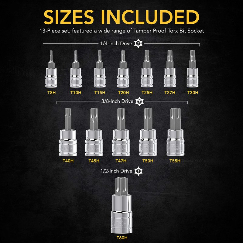 - PREMIUM - 13-Piece set, Featured a wide range of Torx Tamper Proof Bit Socket. Crafted and Designed with superior materials for increased torque and unmatched hardness.