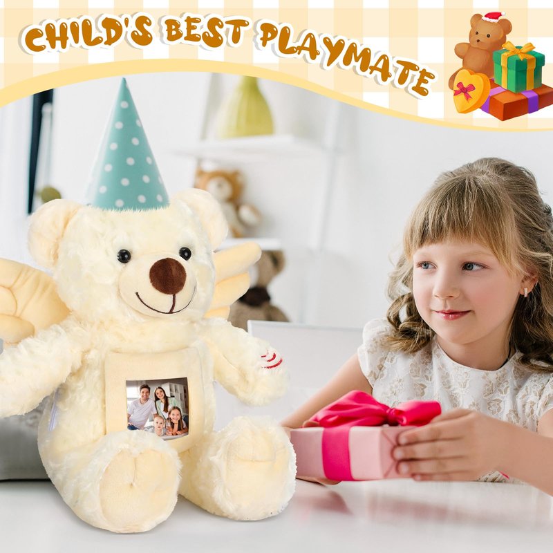 - Package Contents: you will receive 1 angel bear, equipped with a recorder with standing height of about 12 inches/ 30 cm, sitting height of about 10 inches/ 25 cm, adorned with angel designs and a photo frame that can hold a photo or a letter of about 3.2 x 3.2 inches; The built in recorder allows you to record some warm greetings, which makes it cute and eye catching, making it a favorite among most people