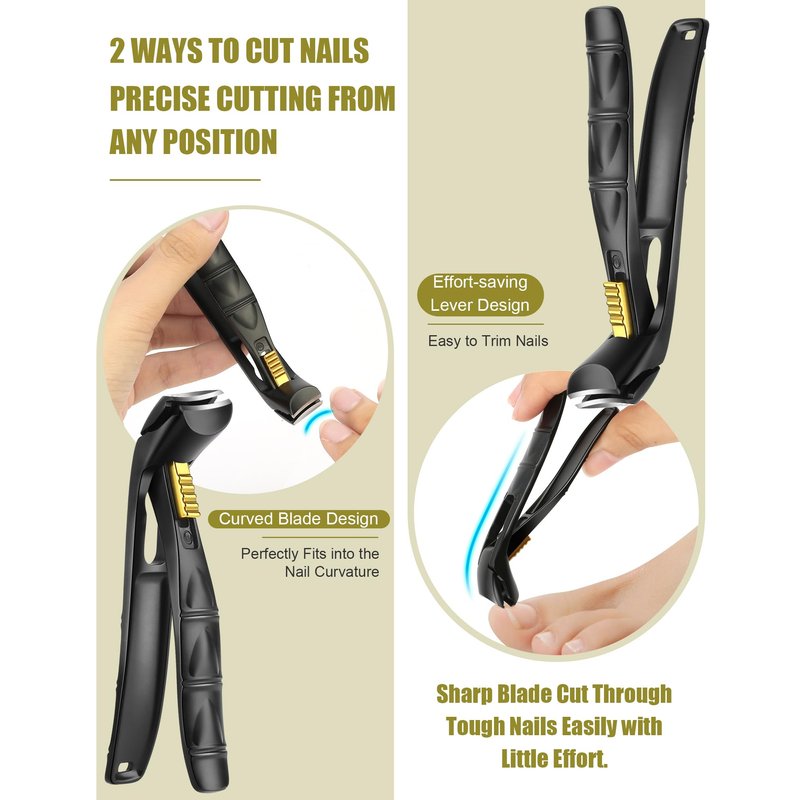 - ANGLED HEAD DESIGN - No Need to Bend & More Comfortable. The innovative bionic angled head design is ergonomically designed to provide a clearer view of the blade edge and nail for accurate, confident trimming. With this angled nail clipper you can trim toenails with ease, there is no more awkward twisted posture in order to cut your toenails. Perfect for seniors, pregnant women, and individuals with back pain or arthritis.