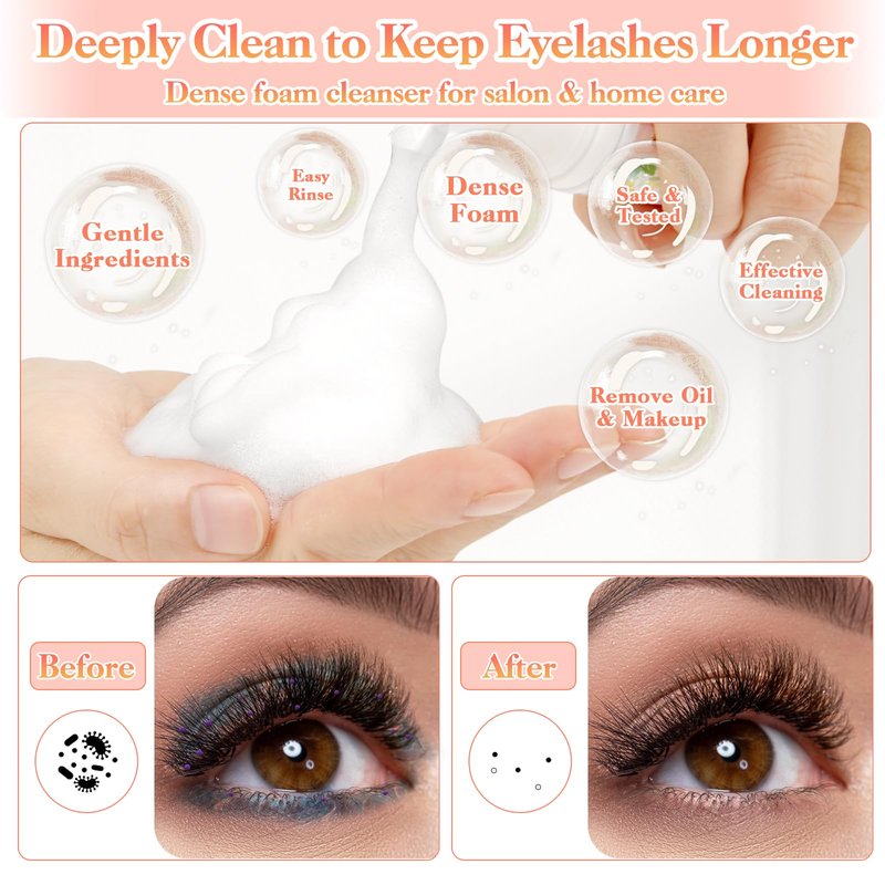 - Gentle Cleaning & Nourishing: This eyelash foam cleanser is a natural premium formula that is non-irritating and non-odor, nourishes and protects your lashes, and is specially designed to remove dirt, oil and makeup residue from lashes. Extend the life of natural and artificial false eyelashes, leaves them fluffy, and prevent any infections.