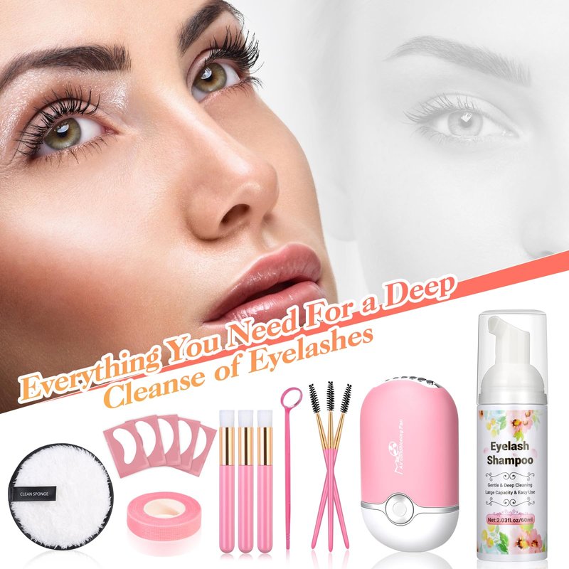 - Fully Equipped Eyelash Wash Kit: Eyelash wash kit contains 1 bottle 60ml unscented eyelash shampoo, 3 pcs mascara brushes, 3pcs cleaning brushes, 1 cool air rechargeable air conditioner fan, 1 small mirror, 1 cotton puff, 1 lash tape and 5 Pcs eye pads. Totally 16 pieces. Our range of tools is more complete than others. This set of lash shampoo perfectly meets the needs of eyelash cleaning.
