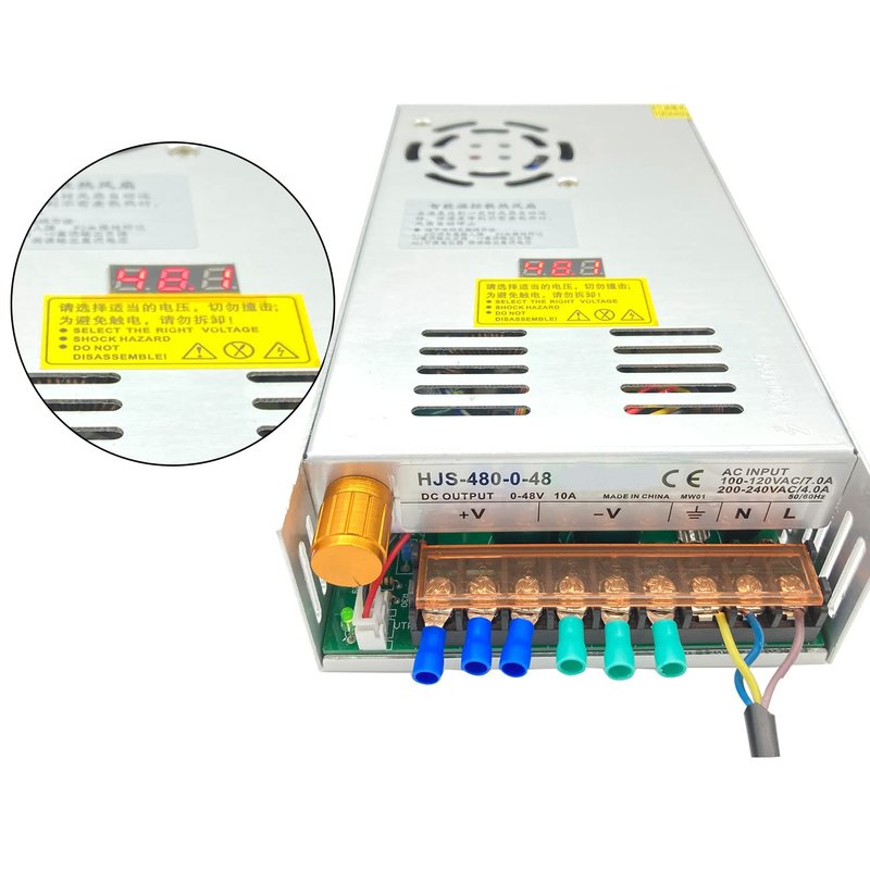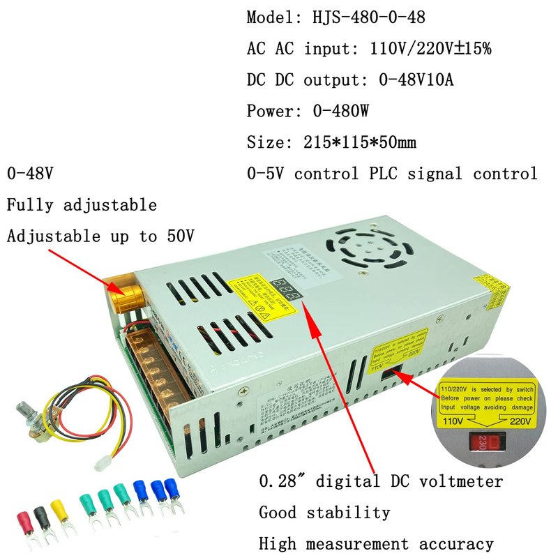 - Universal input voltage: AC 110-220V; output voltage: DC 0-48V 10A; maximum output rated power: 480W. Voltage is adjusted in the range of 0-48 volts by internal potentiometer. Output voltage is displayed digitally. Current limit is not adjustable, current is fixed at 10A actual current is determined by load.Voltage error ±0.1V