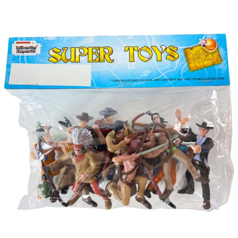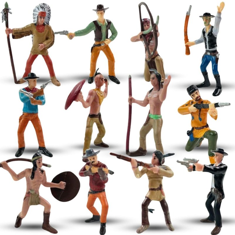 - THE WILD, WILD WEST: Discover the frontiers of your Imagination with this 12-piece cowboy and Native American toy figure playset. Each figure measures approximately 3" tall and features weapons and attire that represent the Wild West era.
