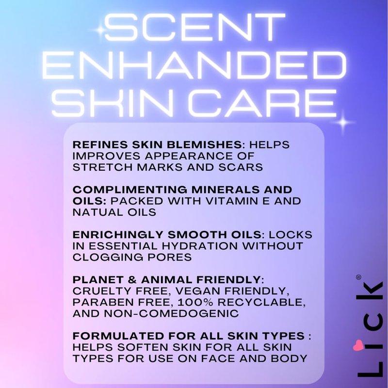 Indulge your skin in the lush, vibrant essence of summer with Lick Raspberry Scented Body Oil. This exquisite 4 ounce body oil is infused with the sweet and tangy aroma of ripe raspberries and the powerful, skin-loving benefits of Vitamin E. The antioxidant capabilities of Vitamin E protect your skin from environmental stressors, aid in the skin's natural healing process, and help improve the appearance of scars and stretch marks. This lightweight, unisex body oil ensures your skin not only delights in the raspberry aroma but also reaps the rewards of enhanced health, elasticity, and radiance. It can be used to moisturize dry areas of the body. The bottle measures 7 inches tall with a 7 inch bottle length.