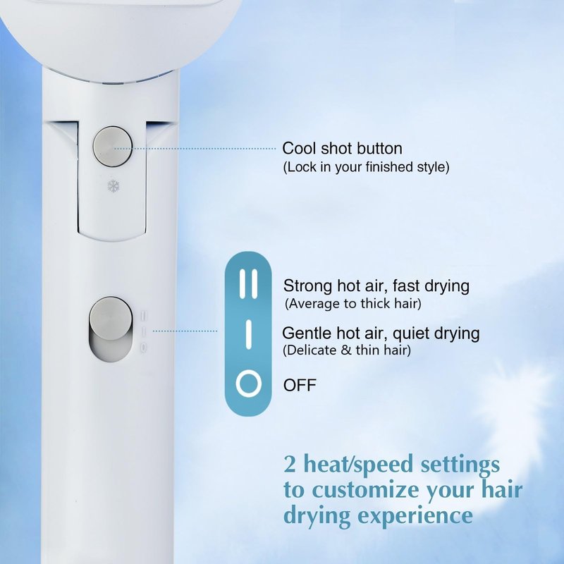 - 【Compact Portable Design】Weighing 0.9lb, this foldable blow dryer features a folding handle for compact storage, making it easy to pack in a suitcase or carry-on bag or store in a drawer; This 1600 watts hair dryer generate high wind speed and proper air temperature for fast drying yet no heat damage. It is perfect for travel/home.