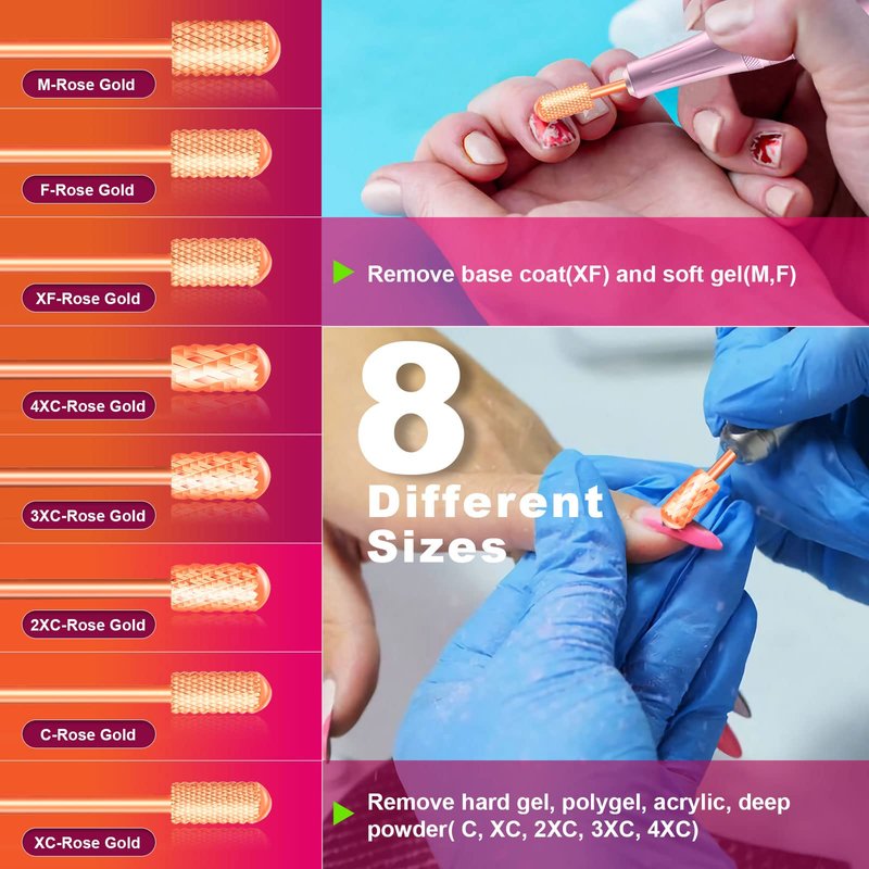 - Package: 1 piece * Color: Rose Gold * Grit: Extra Fine(XF)/ Fine(F)/ Medium-(M)/ Coarse(C) / Extra / Coarse(XC) / Double Coarse(2XC) / Triple Coarse(3XC) / Quadruple Coarse(4XC). Enjoy your salon nail drill art at home with 8 different kinds of nail drill bits.