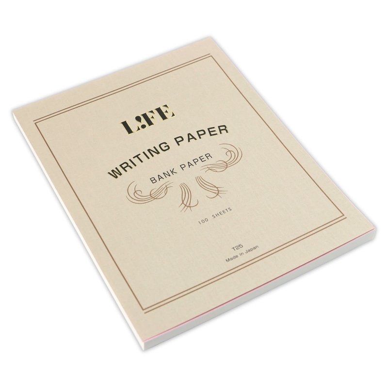 This bank writing paper is popular among pen lovers. It consists of high-quality 100 sheets in approximately A4 size. This fine, plain, smooth paper is perfect for important documents and can serve as an artwork canvas. This paper is fountain pen-friendly, keeping ink feathering and bleed-through away while providing an incredible depth of shading, especially with more complex inks. Included in this pad is one sheet of pink blotting paper. Made in Japan.