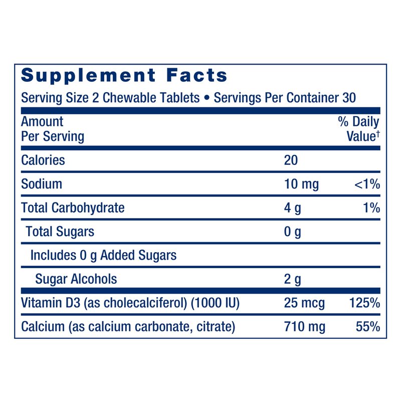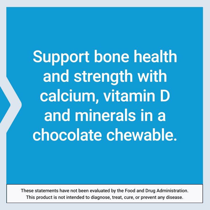- Calcium for bone health and density – Healthy bones need calcium to stand the test of time. These tasty chocolate chewables contain 710 mg of two forms of calcium (calcium carbonate and calcium citrate) to maintain bone density and strength.