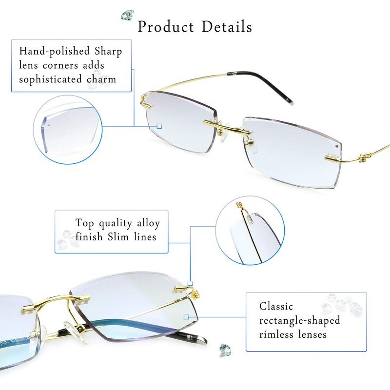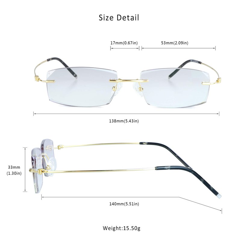 - Classic rimless frame design, ultra-lightweight, no pressure on your face and ears, durable with sturdy alloy frame