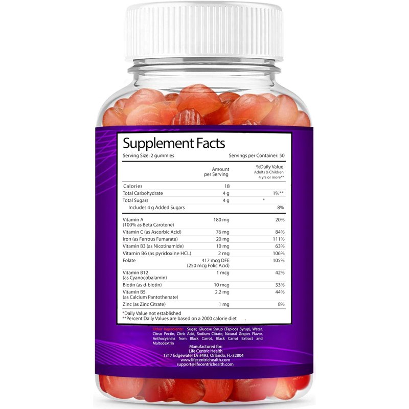 LifeCentric Health Iron Gummies are a tasty, easy addition to your daily routine. Boost your energy and provide healthy iron levels without nausea or upset stomach. We use a pectin base from natural fruits as a more healthy and fresh alternative. We use all-natural grape flavored ingredients to help ensure you and your kids will love the taste of these gummies.