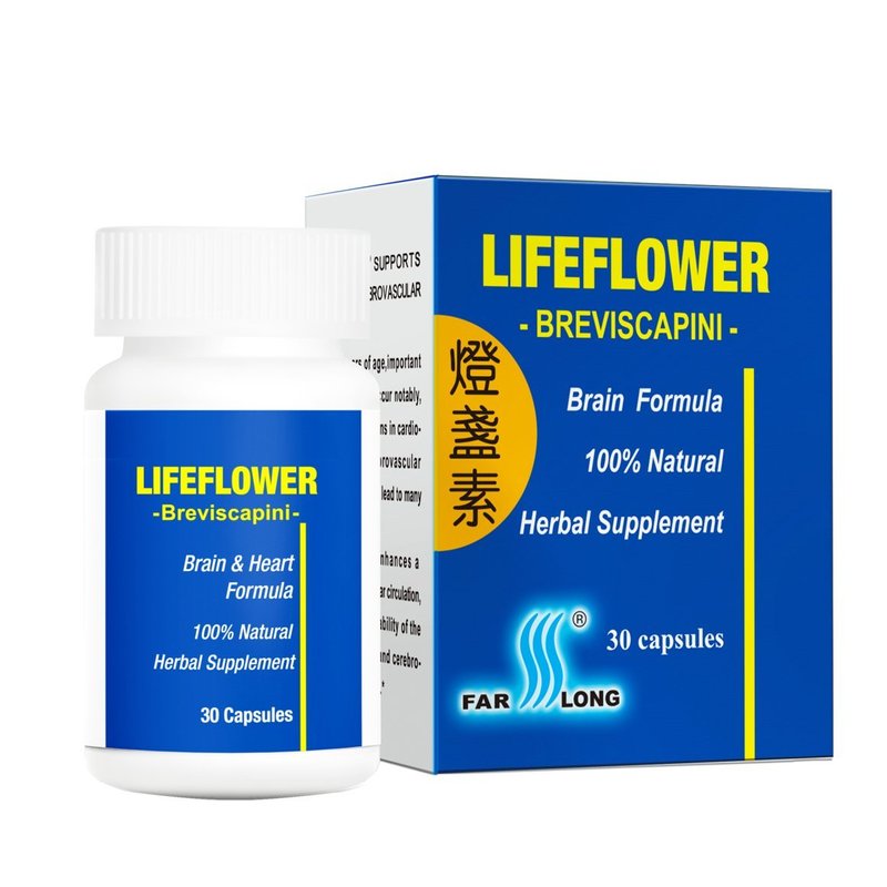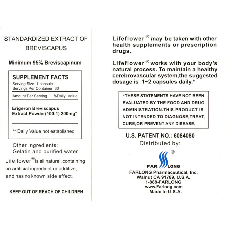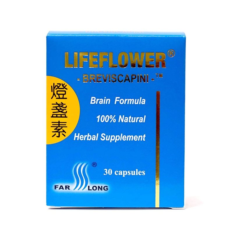 Lifeflower Brain Formula 30 Caps from Far Long PharmaceuticalsLifeflower Herbal Supplement, 30 capsules U.S. Patent 6,084,080 Lifeflower is rapidly absorbed by the human body after oral administration. Lifeflower supports brain health, memory and post-cerebrovascular accident recovery. Lifeflower is all-natural, does not contain any artificial ingredients or additives. Lifeflower supports a healthy cerebrovascular system. Lifeflower nutritionally supports post-cerebrovascular accident recovery. Lifeflower dosage is only one or two capsules daily. Lifeflower is effective and safe. Supplement Facts Serving Size: 1 capsule Servings Per Container: 30 Amount per Serving % Daily Value ** Bresviscapinum 200mg ** Daily Values not established Other Ingredients: Gelatin & purified water Lifeflower Brain Formula 30 Caps from Far Long PharmaceuticalsUPC: 689201830014
