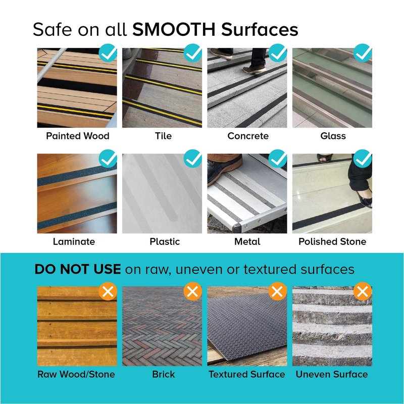 - SAFE ON ALL SMOOTH SURFACES - All LifeGrip Anti-slip tapes and stair thread have thick and aggressive Acrylic adhesive that will form a strong, water-proof bond to Smooth Surfaces, Including concrete, metal, plastic, wood, tile, stone, laminate. DO NOT apply over uneven, rugged, rough, grimy, dirty, dusty, , sandy or muddy surfaces.