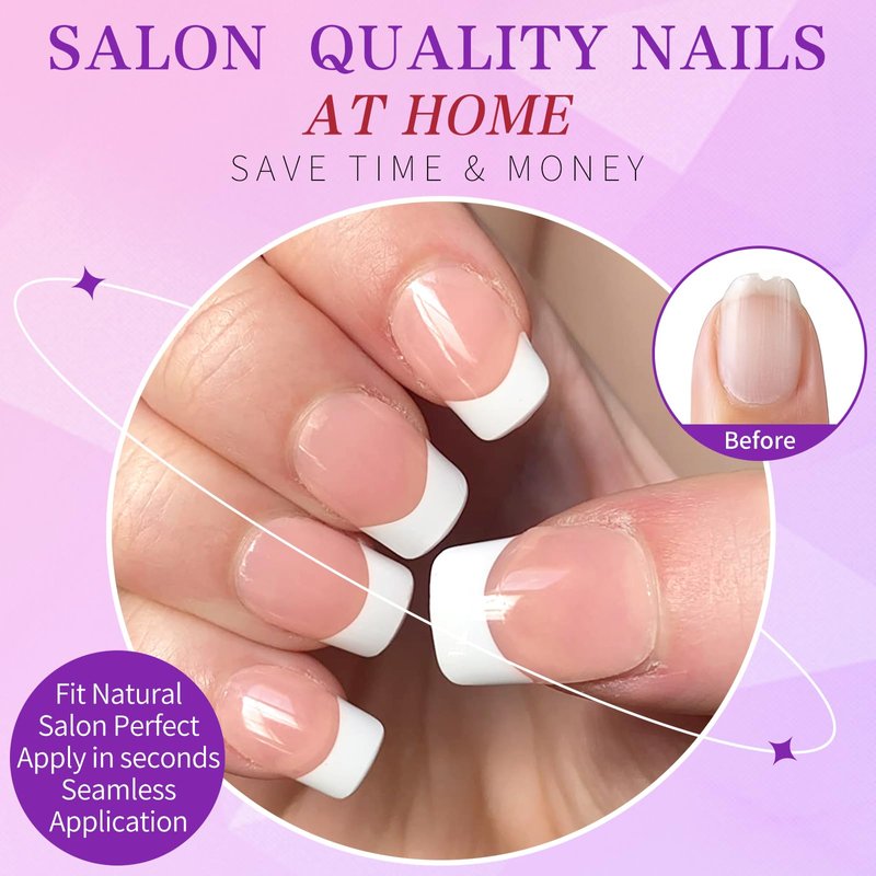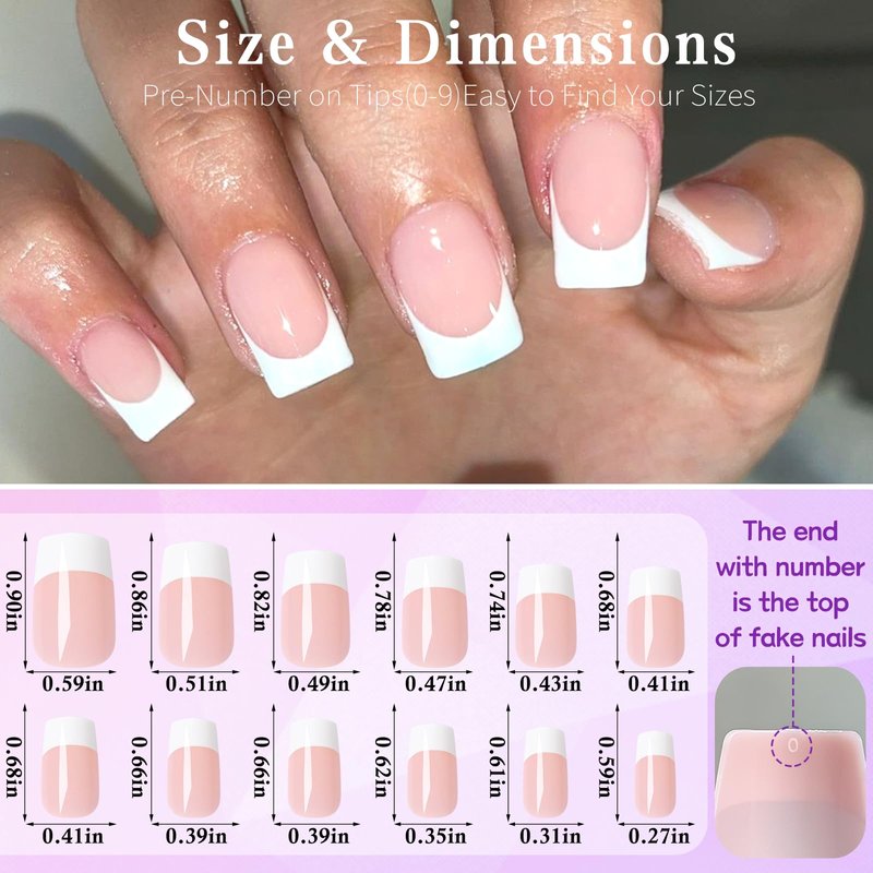 - Best short press on nails pack: Natural nail tips full cover with elegant white french tips pre-colored design, save your money and time to salon, easily get salon perfect press on nails at home. With multiple layer coat design, white French tips of strong press on nails with glue is not easy fade, which is already sealed by top coat, and do not need top coat or cure with UV lamp again, square press on nails kit with glossy finish design is real ready to wear. (Artificial nails tips gel x are pre-numbered for easily find the your size.)