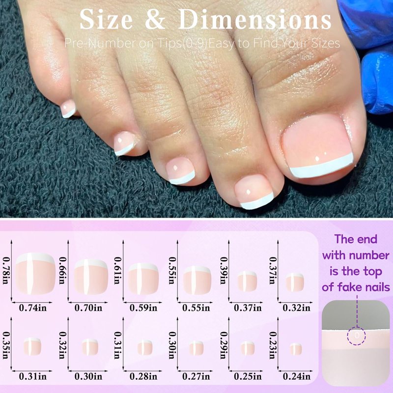 - Acrylic nails press on toenails pack: Short French tip toe nail press ons set, including 240pc 12 sizes fake toe nail tips, 5 sheets adhesive tabs, 1pc nail glue, 1pcs nail file and 1pc nail stick. Toenail press ons sets includes 240pcs French tip press on nails short length and all essential tools to manicure, big quantity toe press on nails square shape with multiple sizes which can fit kids, girls women, teens, prefect DIY short fake toe nails press on set for you enjoy manicure time with your family and friends together!