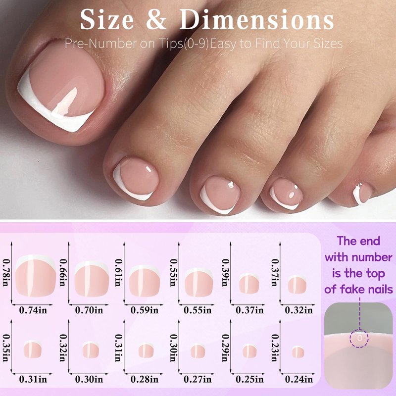 - Acrylic nails press on toenails pack: Short French tip toe nail press ons set, including 240pc 12 sizes fake toe nail tips, 5 sheets adhesive tabs, 1pc nail glue, 1pcs nail file and 1pc nail stick. Toenail press ons sets includes 240pcs French tip press on nails short length and all essential tools to manicure, big quantity toe press on nails square shape with multiple sizes which can fit kids, girls women, teens, prefect DIY short fake toe nails press onset for you enjoy manicure time with your family and friends together!