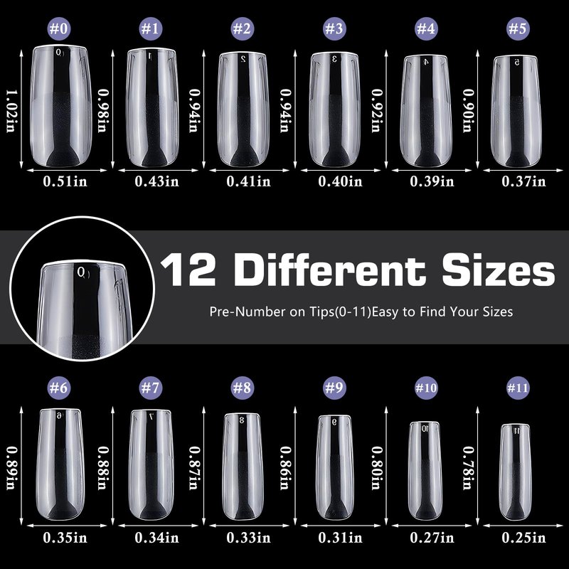 - Various sizes gel x nail tips square shape: full cover nail tips square shape includes 600 pcs full nail tips square shape with 12 different sizes, easy to choose the suitable size for every fingernail. Clear square tips press on big nail beds may look shorts, on small nail beds looks long. Please check gel x nails size and get detail size measurements, and choose ideal nail set, or our soft gel nail tips can be customized and reshape by cutting the nails to get your ideal length, perfect for nail lovers to DIY!