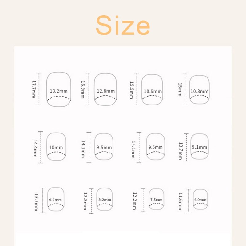 - 【Package】: There are 24pcs of short coffin artificial finger nails 12different size, 1 mini nail file, 1 small wooden stick, 1 nail sticker in the package.(Jelly glue doesn't last as long as liquid glue, but it can make fake nails reusable. Please use suitable glue according to different occasions).